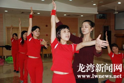 今年是“三八”国际劳动妇女节98周年,为了充分展示龙湾女性的飒爽英姿,我区在节日期间将举行“妇女·健身与奥运同行”大型表演活动。图为健身教练在指导区直机关单位女同志练习健身舞。叶繁摄