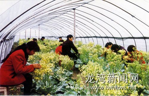 农业示范区龙牌花菜种子占全国60%市场份额,荣获“浙江省首批农业名牌产品”称号。图为科技人员为花菜传授花粉。