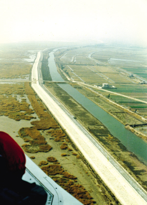 飞机降低高度,向永强机场徐徐降落。机窗外,一条白色巨龙正舒展在眼前,它的外侧是风平浪静的东海,里侧是万顷良田、鳞次栉比的大片新厂房。这条横卧东海之滨的巨龙,就是永强高标准堤塘,一条让永强人从此告别千百年海侵灾难的生命线;一条已凸显巨大经济效益的致富线。
