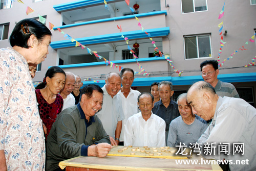 日前,天河镇新河村老人公寓落成,公寓共有100多间套房,现已入住140多位60周岁以上的老人。公寓旁还建有村级公园,老人闲暇时可以下棋、散步、健身。图为老人们正在下棋,其乐融融。叶康远摄