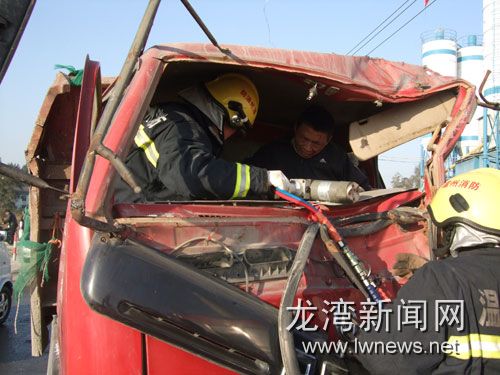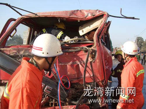 龙湾新闻网讯12月11日7时40分许,两辆运沙的大货车灵昆镇灵昆路发生了严重的“亲密接触”其中一辆货车被撞得旋转了90度,事故造成2人受伤。 7时45分,龙湾消防大队接到报警后,迅速出动1辆抢险救援车9名官兵赶赴现场。 救援人员到达事故现场后看到:现场一片狼藉,整个路面撒满了玻璃碎片和相撞后的脱落物。一辆牌照为浙C.11430的大货车车头已完全变形,驾驶员被困在车内无法动弹,而另一辆牌照浙C.11380货车也被撞得变形,在周围群众的帮助下,浙C.11380货车的司机已被救出。