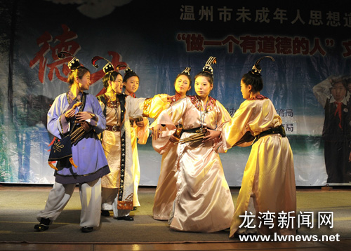 为切实推进未成年人思想道德建设,近日由市文明办、市教育局主办的以“做一个有道德的人”为主题,以“知荣辱、树新风、我行动”为主要宣传内容的未成年人思想道德建设文艺巡演进学校活动在我区中小学举行。图为瑞安越剧团演员在龙湾中学表演的课本剧《滥竽充数》。陈洁摄