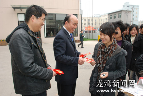 龙湾新闻网讯为了鼓励员工春节后回公司上班,温州大自然鞋业有限公司今年开春为员工增加了一项新的福利——“新年红包”,800多名一线工人在上班的第一天收到了这份意外的惊喜,每人200元的新年开工礼着实让他们欣喜不已。图为公司总经理现场为员工发放红包。