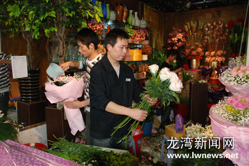 龙湾新闻网讯随着人们生活方式的转变,越来越多的人探亲访友选择送鲜花当礼物。近段时间,过新年、情人节,鲜花市场生意一片火爆,给寒冬里的经济带来一阵暖意。图为永中罗东街一鲜花店忙碌的情景。