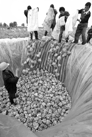 昨天,龙湾区永兴街道稻田套种榨菜田里一片繁忙景象,收购商在现场一边收购,一边在农田挖坑腌制。收购商老张说,当日每公斤榨菜0.52元,与去年同比下降50%。价格下降原因是今年稻田套种榨菜面积扩大,产量增加。