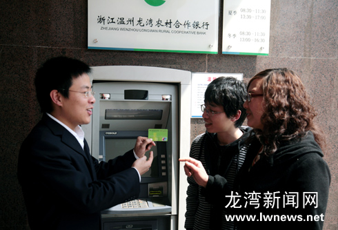 图为龙湾农村合作银行员工向衙前村农户讲解ATM机的使用方法。