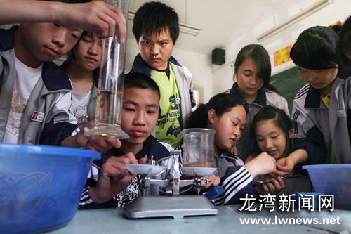 图为温州育英学校生态监护站行动研究小组成员在实验中。