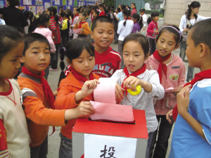 当天,在该校的宣传栏里,48名小候选人自制的个人文明风采展板整齐有序地排列着。该校学生按照年级段,陆续参与了评选投票。此次活动评选的标准是学生在校内校外、在家庭中的言行是否文明礼貌,全校师生及全体学生家长都成了评委。3月中旬评选启动后,两个月里,各班班主任都将学生自评与各任课教师、家长评价相结合,进行班评,推荐各班阳光男孩、女孩各1名,并对材料进行了公示。