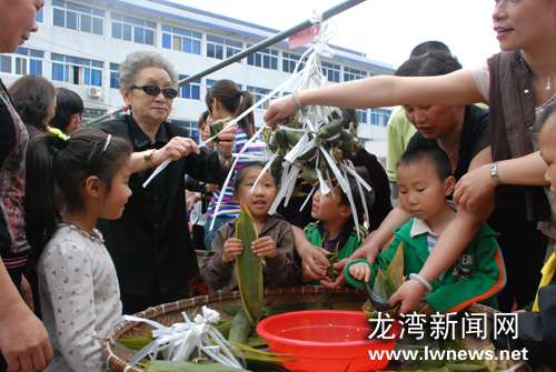 端午节将至,为让孤寡老人也能够体会到浓浓的节日气氛,日前,我区瑶溪镇30多名妇女带着孩子给福利院近百名老人做了一顿丰盛的“粽子大餐”,陪着老人提前过了一个温馨的端午节。图为福利院老人手把手教孩子包粽子。