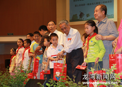 图为区“五老”人员向新龙湾儿童送上慰问金和节日礼物。