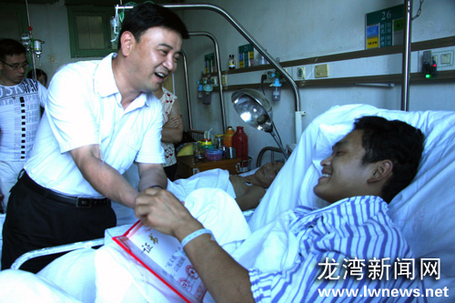 龙湾新闻网讯7月17日,区委副书记、区委政法委书记徐国信一行专程前往附一医八院区,看望了见义勇为身负重伤的协警队员袁朝清,并授予“见义勇为”个人荣誉称号,送上慰问金一万元。 7月11日凌晨1时许,温州工业园区巡逻队湖北籍队员袁朝清与队友骑着摩托车巡至上岙公园。铁塔边蹿出两名可疑人员,袁朝清看得很清楚,两人的手里都拿着半米多长的马刀。袁朝清大约追赶了20多米,对方突然转身持刀砍了过来,他本能地用手护住头部,手腕处突然感觉一阵剧痛,鲜血喷涌而出……据了解,袁朝清的右手腕被砍得只剩一层皮连着,经过医院方面十几个小时的全力救治,目前他的断手已经被接上,医生估计很难恢复全部功能。 徐国信在详细了解袁朝清治疗和恢复情况后说,袁朝清的勇敢行为感人至深,体现了在关键时刻、危难时刻迎难而上的可贵品质。徐国信希望袁朝清安心养病,并祝愿他早日康复。 袁朝清对徐国信一行的慰问表示感谢,同时表示虽然右手被砍断,但对自己的做法丝毫没有后悔。出院后,一定会继续坚守岗位,尽职尽责。(王鹏)