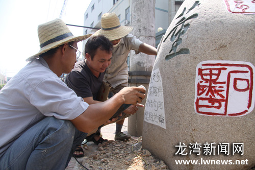 日前,海滨街道宁村村精心打造的中华百家姓石刻已经完工101个,分布于村中的各条主要街道。据介绍,所雕刻石块均从楠溪江运送过来,每一个石头上的姓氏由温州知名书法家书写。宁村村人口3000多人,本地村民登记在册的姓氏就有92个。目前,该村正向相关机构申报“中华姓氏第一村”。图为宁村村委会主任徐顺炜与石刻师傅一起探讨雕刻方式。王鹏摄
