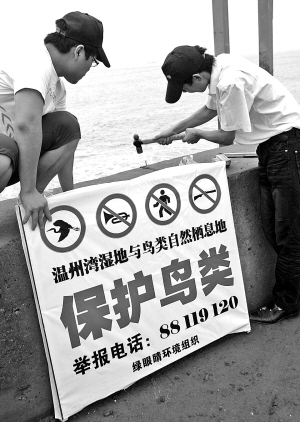 又到候鸟从北方飞来温州越冬或经温州再向南飞的季节。昨天,温州“绿眼睛”志愿者在候鸟的主要栖息地——龙湾湿地设立保护宣传牌,告诫市民保护好来温的候鸟。