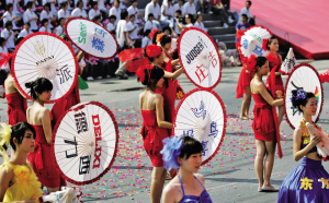 方阵分为红黄蓝绿四种颜色,每名演员穿着不同的服饰,既突出了品牌个性,又富有时尚元素,整个方阵又有统一点——每名演员手拿特制的伞(见图)。
