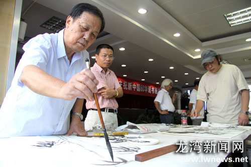 图为来自温州书画院的知名画家在蒲州街道举办的“综治杯”庆祝新中国60华诞书画笔会上现场创作水墨画。王鹏摄