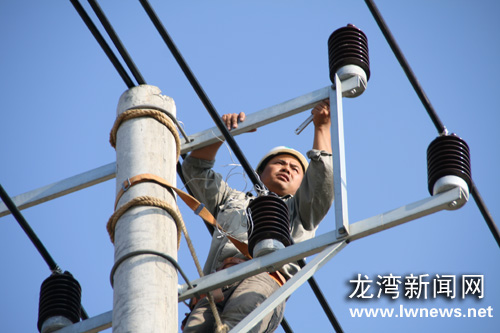 图为电力工作人员在安装电力设施。王鹏摄