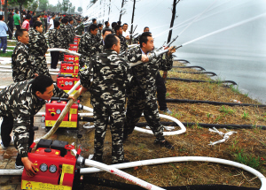 今天是“119”消防日。龙湾区147支村居义务消防队成立,现场还发放消防水枪和消防手抬泵等消防器材,消防官兵还为义务消防队员指导相关操作。至此,该区每个村都建立了义务消防队,实现村村全覆盖。图为60支消防水枪同时试射,比比谁的喷水半径更大,灭火能力更强。王胜利徐华东