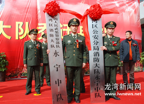 龙湾新闻网讯我区消防布局有了新格局,近日,龙湾区消防大队乔迁新址,同时我区还新设立永宁消防中队。 龙湾区消防大队新迁至瑶溪生活区A地块,新址严格按照有关消防站建设标准,标志着我区消防基础设施建设又上了一个新台阶。新设立的永宁消防中队配备了3辆消防车和30名消防员,主要担负中心区、温州工业园区、瑶溪镇以及灵昆镇灭火救援任务。 图为永宁中队授牌现场。叶康远 摄