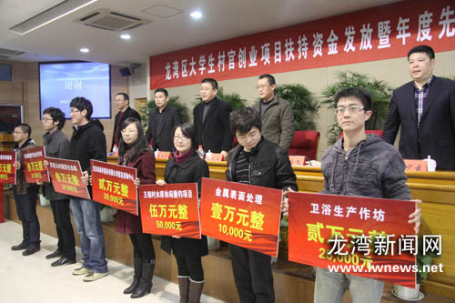 龙湾新闻网讯为激励支持大学生村官在基层带民致富、创业成才,1月29日,我区举行大学生村官创业扶持资金发放仪式。7名大学生村官“领衔”的创业项目通过了专家组审核,分别领到一万到五万元不等的扶持资金。黄静摄