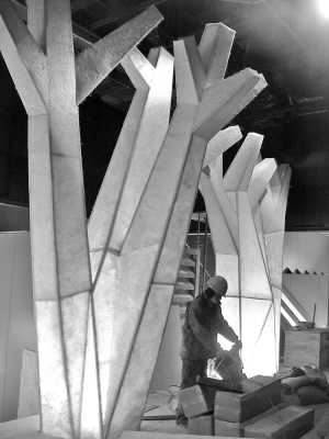 浙江聚光科技有限公司的LED灯具在世博会中国馆内现场施工的情景。 郝涛涛摄
