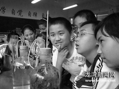 图为日前温州育英学校低碳环保生活志愿者大队的同学实验过程中正在观察发酵罐内的温度。