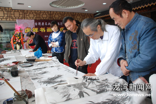 龙湾新闻网讯4月22日,由台湾著名书画家王德亮先生以老虎为题材创作的书画作品《虎年百福展》在温州文化用品市场展出。展会吸引了全区众多书画爱好者前往参观学习,有力促进了海峡两岸书画艺术的交流。据了解,王德亮是吴昌硕画派的入室弟子,既精国画又善油画,2007年被中国美术天地专业刊物推荐为亚洲优秀艺术家,现为台湾中华亚细亚艺文协会理事长。图为王德亮与我区书画家共同磋商技艺,现场泼墨挥毫。叶康远江国荣摄