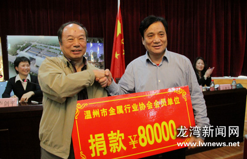 龙湾新闻网讯连日来,我区企业界纷纷开展向玉树灾区捐款捐物活动。图为日前在区慈善总会状元分会牵头下,温州市金属行业协会组织54家企业开展捐款活动现场。江国荣摄