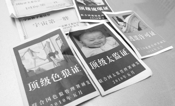 记者昨天在水心小学一、二校区门口发现,有四五家小卖部在显眼处挂售这类恶搞贴纸。贴纸售价为5毛一包,内装六张不同内容的贴纸,格式仿造证件和奖状。如“顶级色狼证”由“联合国色狼管理署”颁发;“最佳雷人”的奖状,内容为XX同学被评为“最佳雷人”,特发此状,以资鼓励;还有形形色色的“逃课许可证”、“胖胖许可证”、“顶级流氓证”等。