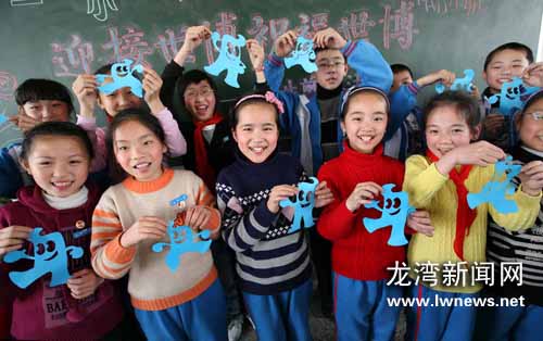 图为学生手拿剪纸作品“海宝”,齐声高呼“迎接世博、祝福世博”的口号。
