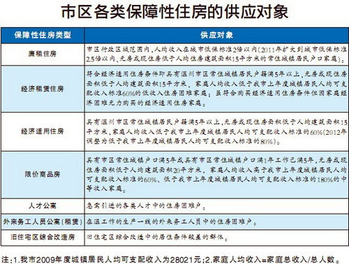温州网讯市政府办公室昨天发布《温州市区住房保障规划(2010-2012年)》,随着该项规划的发布,市区各种类型保障性住房的供应对象也已明确(详见附表)。