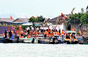 在码头上,记者远远看到二三十位身穿救生衣、头戴安全帽的工作人员,正在对海上皇宫的跑马场进行拆除。几艘快艇不时穿梭往来。