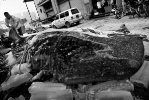 昨天凌晨3时,经过7个小时航行,这条金钱鲨被渔船拖到瑞安东山渔港码头。一辆能起吊几十吨重的吊车,将这条金钱鲨吊到一辆货车上,送到瑞安东山一家酒楼门口。