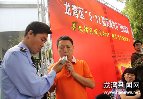 龙湾新闻网讯5月12日,由区人防办、应急办、科技局、民政局等11家单位联合举行的“防灾减灾日”宣传活动在蒲州、状元、永中三地同时举行。此次活动主题为“普及防灾减灾知识,提高防灾减灾能力”。图为市交警三大队警员为群众测验酒精含量,向群众讲解其工作原理,宣传酒后驾驶的危害。王鹏摄