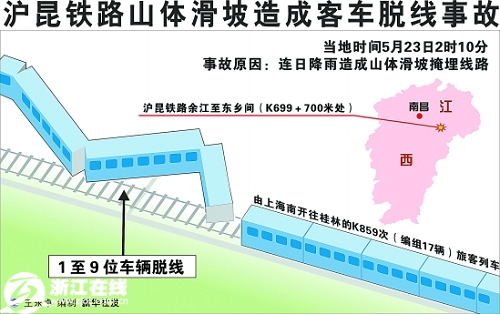 23日2时10分,因连日降雨造成山体滑坡掩埋线路,由上海南开往桂林的K859次(编组17辆)旅客列车,运行至江西省境内沪昆铁路余江至东乡间(K699+700米处),发生脱线事故,机车及机后第1至9位车辆脱线,中断上下行线路行车。