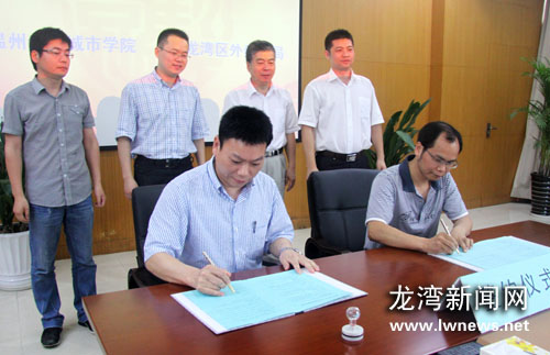 龙湾新闻网讯日前,区对外贸易经济合作局与温州大学城市学院合作,设立“温州外贸专业人才培养基地”。合同签订后,该局将为双方共同选拨的学生推荐实习岗位和社会实践机会,指派专业的人员进行指导培训。城市学院则为温州外贸专业人才培养基地提供相应的活动场所和活动设备,出师资对学生进行相应的培训。图为签订现场。王鹏摄