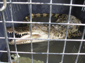 钱仓派出所接到报警后,也感到棘手,就联系了平阳县海洋与渔业局,该局又通知了温州绿眼睛组织。该组织工作人员赶到现场发现,这是一只未成年湾鳄,重约3公斤,长1米,主要分布在东南亚及澳大利亚北部一带,性情凶猛。它在平阳鳌江流域出现,着实让人吃了一惊。放生不但会对生态造成影响,还会给人带来安全隐患。