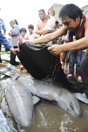 昨天下午4点左右,记者和龙湾区渔政站同时赶到五溪村。记者看到,两只活的江豚大的重约100斤,小的重约70斤,旁边是它们死亡的同伴。龙湾区渔政站的工作人员何文剑说,3条江豚可能是一家三口。