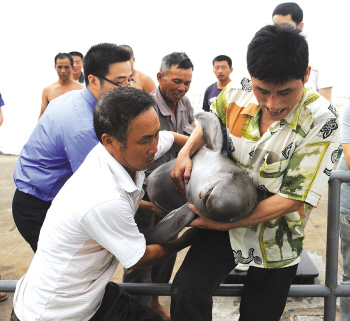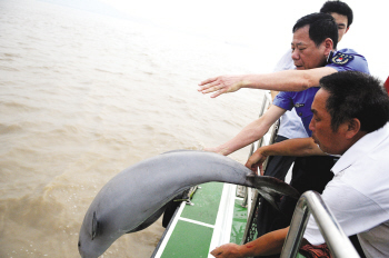 码头上,渔政部门一艘快艇早已在现场等候。17点40分,两只活着的江豚被抬上快艇,何文剑提了一桶水倒在它们身上。也许是太渴了,当水倒在它们身上的时候,一只江豚张开了大嘴。