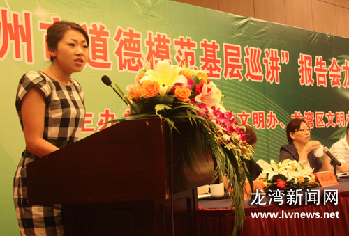图为文成县峃口乡学校教师夏小敏介绍市第二届孝老爱亲道德模范刘冬美先进事迹。王鹏摄