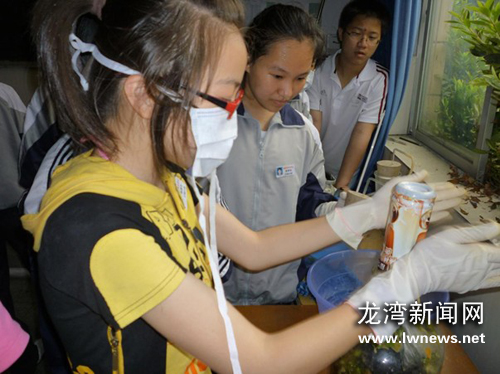 图为温州育英学校环保志愿者在对餐厨垃圾进行试验。高琼林摄