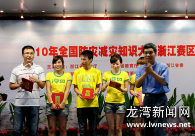 龙湾新闻网讯近日,状元镇作为温州市的唯一代表,参加2010“中国人保——防灾减灾知识竞赛”浙江赛区选拔赛。比赛过程中,状元代表队与来自全省各地的10只代表队,经过必答题、抢答题、情景模拟题,风险题等几番较量,最终凭借团结协作精神和扎实的理论基础,以优异的表现获得冠军。据悉,状元镇还将代表浙江省赴北京参加全国总决赛。图为状元代表队领奖现场。江国荣徐伟供图