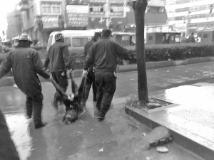 4名警务人员拖着被击毙的藏獒离开。丁宇宸摄