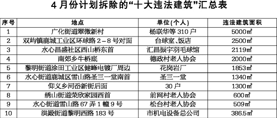 记者还了解到,为响应市委市政府号召,4月中旬,该区将正式全面开展“六必拆”——党员干部必拆、沿路沿河必拆、妨碍建设必拆、安全隐患必拆、顶风违建必拆、大型违章必拆。