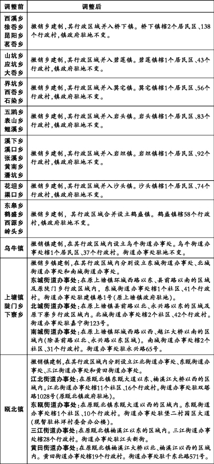 调整后,乐清市辖乐成、城东、城南、盐盆、翁垟、白石、石帆、天成8个街道和柳市、北白象、虹桥、淡溪、清江、芙蓉、大荆、仙溪、雁荡9个镇。瑞安市辖安阳、玉海、锦湖、东山、上望、莘塍、汀田、飞云、仙降、南滨10个街道办事处和塘下、陶山、湖岭、马屿、高楼5个镇。永嘉县辖东城、北城、南城、江北、东瓯、三江、黄田、乌牛8个街道办事处和桥头、桥下、大若岩、碧莲、巽宅、岩头、枫林、岩坦、沙头、鹤盛10个镇。苍南县辖灵溪、龙港、金乡、钱库、宜山、马站、矾山、桥墩、藻溪、赤溪10个镇和凤阳、岱岭2个畲族乡。(记者陈蜜)