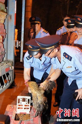 5月8日凌晨,重庆市工商局执法人员在该市包茂高速巴南收费站对贩运活鸡鸭来渝的经营户进行检查。中新网发张燕摄