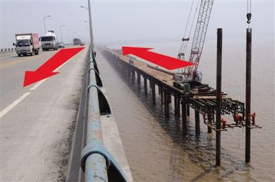 是77省道延伸线工程的一项内容,桥面设计为二车道,从今年4月份开工,工期总计32个月。目前已完成栈桥搭设近三分之一的任务,累计完成工程量1570万元,占总工程量7%。据了解,新的右幅桥今后将作为市区往洞头方向的车道,而老的左幅道则作为洞头往市区方向的车道。