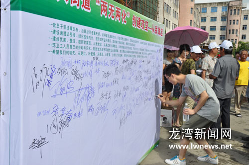 7月17日,永兴街道举行声势浩大的“两无两化”创建攻坚千人誓师大会,全面发动广大干部群众积极参与拆除违法建筑、拆围去丑、洁化、绿化、塘河两拆两绿等各项创建活动,进一步营造整洁优美、文明健康、和谐有序的生产生活环境。图为签名现场。徐芳摄
