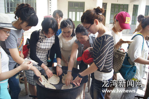 龙湾新闻网讯由团区委、区教育局、区少工委联合举办的区第八期少先队辅导员培训班日前开班,来自全区各中小学、外来民工子弟学校的大、中队辅导员共80余人参加了培训。在学习《规范少先队礼仪、少先队与儿童素质教育》等理论知识的同时,学员们还参加了“楠风营地”户外素质拓展活动。图为学员们参观做麦饼农家活动现场。邵赛慧摄