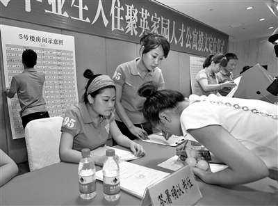 日前,来自132个单位的500余名高校毕业生,在市区新田园四组团的聚英家园人才公寓找到了“家”。作为我市人才安居工程实施以来首批受惠的高校毕业生,他们将在8月底前实现“拎包入住”。图为大学生选房确认现场。许日尤摄