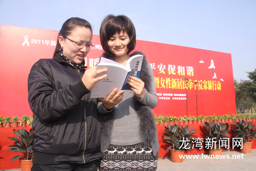 龙湾新闻网讯手牵手同拒家庭暴力,心连心共筑平安家园。11月21日,主题为“情暖半边天,平安促和谐”的温州市反家庭暴力周活动在我区河泥荡文化公园举行启动仪式,同时全市首家女性新居民维权站也在我区挂牌成立。女性新居民维权站成立后,将为辖区内的女性新居民提供有效帮助,依法维护其合法权益。图为女性新居民代表正在阅读温州妇女维权案例。柯露霞摄